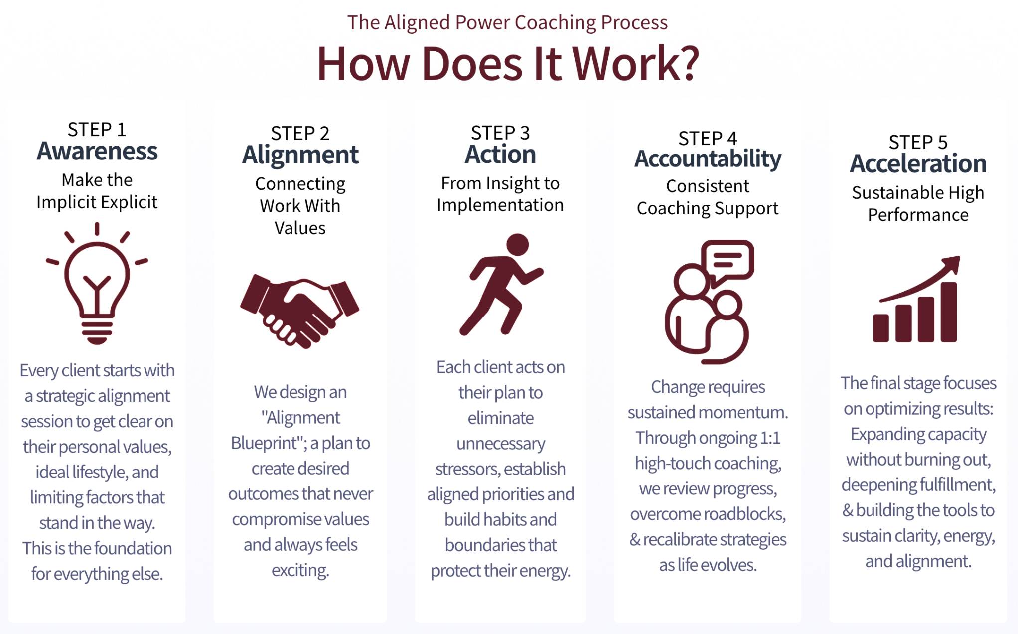 I partner with high-impact business owners and leaders to get their team members to peak performance without burning out or losing what matters most. Through Aligned Power Coaching, I help you identify what matters most and what is standing in the way so that your work and your life fuel each other instead of competing against each other. The result is sustainable energy, thriving relationships, and next-level performance driven by purpose, clarity, and alignment.
